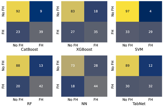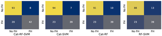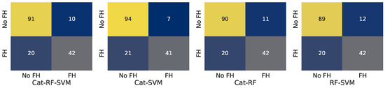 The selected classification models were evaluated using standard performance metrics such as accuracy, recall, precision, and F1-Score. The results of the evaluation of CatBoost, XGBoost, SVM, Random Forest, and neural networks are presented in Table 1. The evaluation of ensemble models using voting is presented in Table 2, while Table 3 presents the evaluation using stack generalization. To gain further insights into the classification results, confusion matrices were generated for each model. These matrices provided a detailed breakdown of true positives, true negatives, false positives, and false negatives, offering a clearer picture of how each model performed in distinguishing between FH and non-FH cases. First, the confusion matrices were calculated for the initial models. The results are presented in Figure 2. Corresponding results for ensemble methods of voting and stack generalization are presented in Figure 3 and Figure 4, respectively.