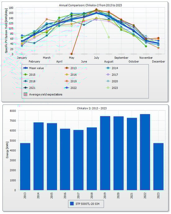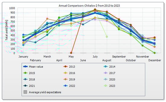 Values of the total energy generated by the 5 kW photovoltaic system—“Chikalov”—located in the town of Simitli, Blagoevgrad, southwestern Bulgaria.