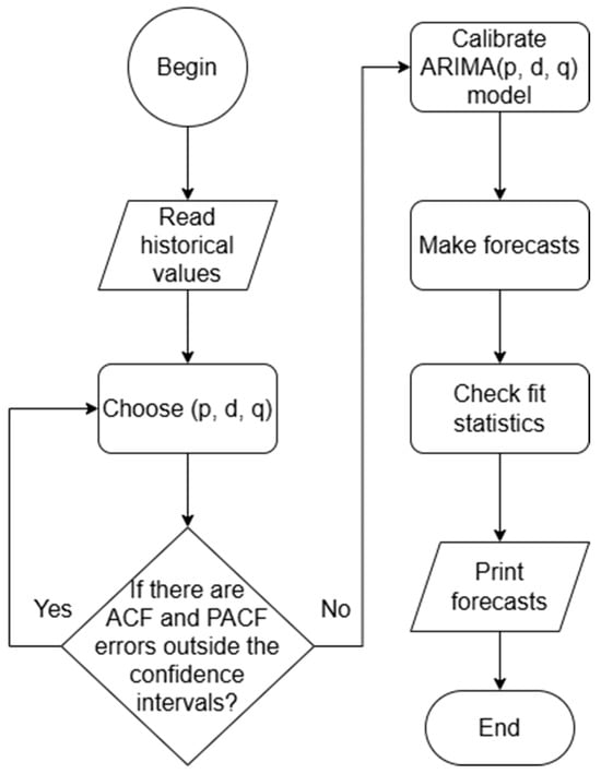 The input variables are the time series of total energy and specific energy yield, given in Table 1 and Table 2. The output (target) variables are the forecasts, which are thoroughly described in the next section. Essentially, the ARIMA method finds a relationship between the input and the output variable and uses this knowledge to make predictions of the target variable. The organization of the algorithm is displayed via the flowchart in Figure 4.
