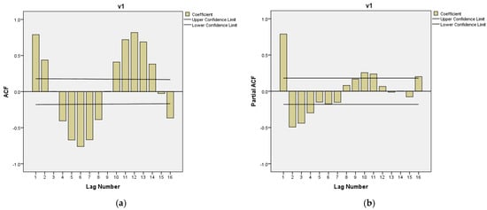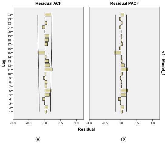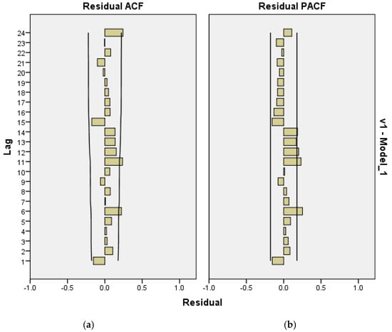 To identify the appropriate parameters , the autocorrelation function (ACF) and partial autocorrelation function (PACF) are examined (see [32]). These functions, which depend on a predefined number of lags, are computed for each time point , excluding instances where computation is not feasible. During the calibration, all the available data are employed, while the residuals’ ACF and PACF are used to validate the models. During the fitting procedure, few of the very first data points are used to initiate the moving average (MA) component, and the rest of the data are used for calibration. The calculations are performed by means of IBM SPSS Statistics software (https://www.ibm.com/products/spss-statistics). If the ACF and PACF of show more than one minor deviation beyond the confidence intervals, the model parameters are adjusted. Significant spikes and repetitive patterns in these functions signal the estimated values of and , serving as the basis for parameter selection in this study.
