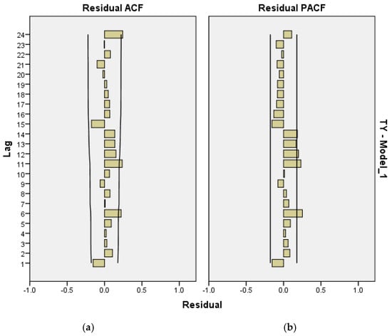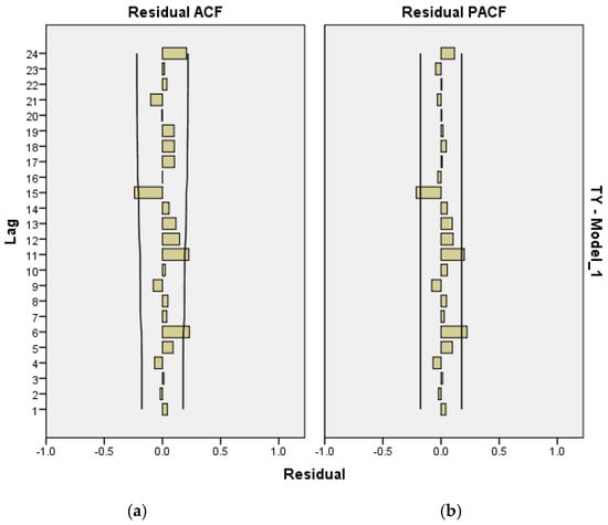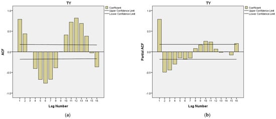 Figure 11 presents the values and the confidence interval of ACF and PACF errors under the ARIMA (2,0,1) model for the total yield time series. Based on this figure, there are three ACF errors and five PACF errors outside the confidence interval for 16 lags. As discussed earlier, a model with a parameter value of at least and can be considered for improvement.