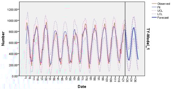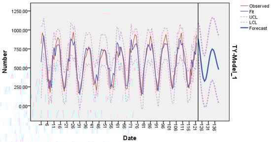 The same conclusions can be made for the total yield (please see Figure 12 and Figure 14; please see Figure 16). The model ARIMA (3,0,5), proposed by the authors, can describe the future dynamics of the total yield. The coefficient of determination of the latter is better than the software-suggested ARIMA (2,0,1) model, while all the other error metrics and the Normalized BIC are less than their counterparts. Again, the forecast for the total yield, together with their 95% confidence intervals, can serve as meaningful and reliable predictions (please see the fourth and fifth columns of Table 12).