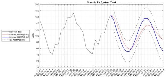 ARIMA approaches have been applied to forecast the data from the 5 kW photovoltaic system—“Chikalov”—for the following 17 months. These ARIMA approaches were implemented using the IBM SPSS Statistics software product [33].