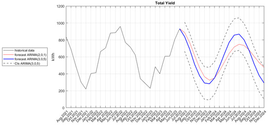 Figure 9 (analogous to Figure 7) shows the real data for the specific PV system yield time series in red, the approximated values by the ARIMA (2,0,1) model in blue, the predicted values in bold blue, and their confidence intervals with the dashed line in purple. Now, the forecast looks very plausible—both the seasonality and the range are coherent with the historical values; thus, we stop at this model.