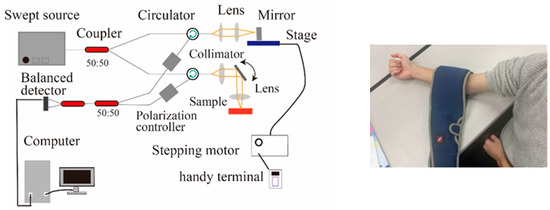Figure 2 shows a custom-made SS-OCT (swept-source) based on a Mach-Zehnder interferometer constructed with fiberoptic components such as couplers and circulators from (Thorlabs, Newton, NJ, USA). The SS-CCT was constructed with a swept light source (HSL-2100-ST, Santec, Aichi, Japan) with a center wavelength of 1310 nm, a scan range of 125 nm, a sweep frequency of 20 kHz, and an average power of 22.7 mW. The light from the source was split into two beams by a 50/50, 1 × 2 optical coupler (TW1300R5A1, Thorlabs, Newton, NJ, USA) to illuminate the reference and sample arms separately. The split light was sent through the respective circulators placed in each of the arms (CIR-1310-50-APC, Thorlabs, Thorlabs, Newton, NJ, USA). The light reflected from the sample and the reference mirror, respectively, after passing through circulators was recombined by 1 × 2 optical couplers (TW1300R5A2, Thorlabs, Newton, NJ, USA). In order to remove the source fluctuations, the interference signal was again split by a 50/50, 1 × 2 optical coupler and then detected by a balanced detector (PDB470C, Thorlabs, Newton, NJ, USA). The reference mirror was mounted on a stepping motor stage (KXL06300-C2-F6A, Suruga Seiki, Shizuoka, Japan) to adjust the path length to obtain the interference signal. On the sample arm, light from the fiber was collimated by a fiber collimator and an OCT Probe unit (Santec, Aichi, Japan) was used to focus light onto the sample. The OCT probe unit also consisted of galvano mirrors (along the lateral directions x and y) that can be scanned to obtain 3-D volume scans. In this study, 2-D scans were acquired by scanning only one lateral axis. The interference signal acquired as a function of wavelength from the sweeping of the wavelength by the swept source was transformed to frequency, wave vector, or k-space, and then was Fourier-transformed to obtain the depth profile of the sample. All signal acquisition was achieved with custom-made software using LabView (LabView ver.2012 National Instruments, Austin, TX, USA). Interference is only obtained when the optical path difference between the object and reference light is within the coherence length, as calculated using Equation (1), which was 6 μm. The lateral resolution of the OCT probe lens unit was 39 μm. In the case of skin, for the conversion of the optical path length to free space length, an index of 1.43 was used [11].