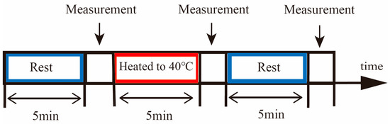 Figure 3 shows the experimental protocol. All of the subjects were instructed to abstain from alcohol intake and strenuous physical activity for at least 24 h before the study. Upon arrival to the experimental room, before beginning the experiment, the subjects were asked to stay idle and take a rest for 5 min. Next, as control data, OCT scans of the dominant hand were acquired. After that, the dominant hand of the subject was fitted with a USB heat pad (WHU-W02 NV, Doshisha, Osaka, Japan) and heated for 5 min. OCT scans were acquired immediately after finishing heating and after 5 min of rest following heating. The temperature of the heat pad was adjusted to 40 °C. The heat pad was chosen instead of the water bath used in [11], as it was found to be easier to maintain a constant temperature. The temperature used was also selected based on the previous reports that it is favorable for passive thermotherapy [4,6]. All measurements were performed in a temperature-controlled room with the temperature being maintained at 23–25 °C.