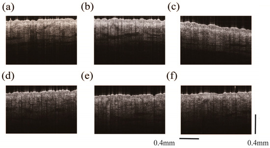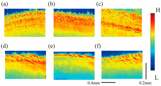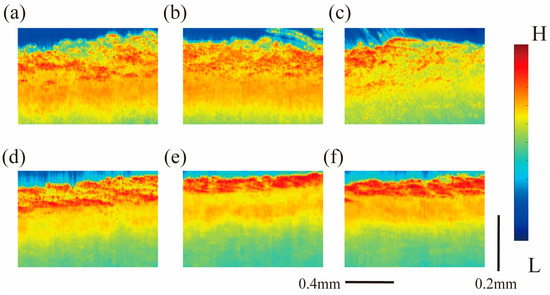 Figure 4a–f show the OCT images obtained for a male subject, with the vertical axis representing the depth and the horizontal axis representing the lateral direction. Here, Figure 4a–c show the images obtained for a male subject aged 20 or above, while Figure 4d–f show the images obtained for a male subject aged 30 or older. Image pairs (a) and (d), (b) and (e), and (c) and (f) are, respectively, those obtained before heating, immediately after heating, and five minutes after finishing heating. The bright areas correspond to higher reflectivity, while the dark regions correspond to regions with lower reflectivity. For both age groups, the laminar organization of the skin can be seen. Moreover, for the group of participants in their 20s, the laminar organization of the skin can be observed along with the blood vessels in the dermis layer under all three conditions. On the other hand, for the 30 and over age group, the laminar organization can be distinguished; however, it can be seen that the blood vessels are barely distinguishable. Moreover, in both age groups, it can be concluded that when changing the environment, it is difficult to distinguish the structural differences from the OCT images themselves. From the OCT images shown in Figure 4, the bOCT images were calculated using Equation (2), and the calculated results are shown in Figure 5.