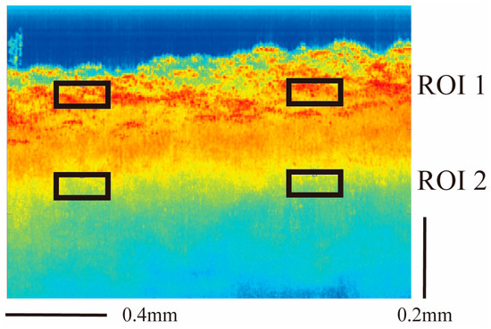 In Figure 5 and Figure 6, a clear difference in the biospeckle contrast can be seen for the conditions of soon after heating and 5 min after heating for both males and females in both age groups. There also appears to be a large qualitative difference between the genders. To analyze such differences quantitatively, local biospeckle contrasts were calculated with two sets of ROIs (regions of interest), with one selected from the shallow region or the epidermis–dermis junction layer or papillary dermis layer (<200 µm) and the other from the deeper region, within the dermis (depth: 600 µm to 700 µm from the surface). The size of the ROIs was selected as around 400 µm (x) × 70 µm (z) (Figure 7). The average speckle contrast was first calculated for each person from two sets of scans obtained under each environmental condition.