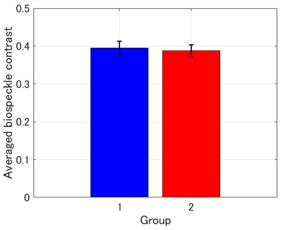 Prior to comparing the heat treatment conditions, to test the temporal variation under the control condition, i.e., under rest before heating, all of the subjects were grouped into two groups of ten and the average speckle contrast over ROI1 was calculated and compared. The control group result is shown in Figure 8. A t-test conducted with the groups revealed no significant difference between them. This indicates that a comparative study could be carried out under different conditions and changes with respect to the conditions being measured.