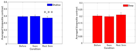 The average contrast was obtained across all subjects, irrespective of gender and age differences, for the shallow (left) and deeper (right) regions, respectively, and is shown in Figure 9. A histogram of the average biospeckle contrast was calculated from ROIs of different depths for all of the participants, irrespective of gender and age. * and ** denote respectively, the average biospeckle contrast before and soon are statistically significant with respect to that of at rest after five minutes of heating. From the histogram results for the shallow region close to the epidermis–dermis border, the effects of heat stress are significant, and this could possibly be due to the surface capillaries crisscrossing the surface along the papillary dermis layer at the border region of the epidermis and dermis. However, as shown in the red columns for ROI2 for the deeper region within the dermis, there is no significant difference in the heat stress dependence of the whole of the population with respect to heat stress.