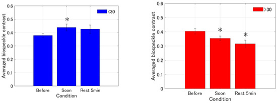 Average speckle contrast for all 10 participants in their 20s (left) and 10 participants in their 30s (right) for ROI1 (shallow region) under different conditions: before heating, soon after heating, and after 5 minutes of rest following heating. * indicates the significance with respect to before heating. There is a difference in the age groups depending on the condition. Based on Figure 9, only the shallow region was investigated.