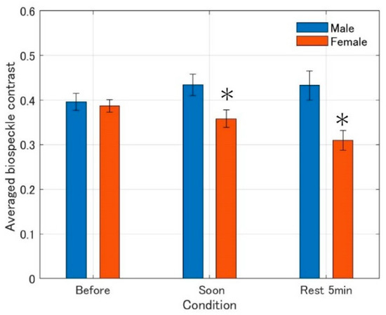 Averaged biospeckle contrast for all male and female participants from the shallow region, ROI1, under different conditions (error bar represents standard error). * indicates that there is a significant difference between the males and females for both immediately after heating and after 5 min of rest, but no significance before the start of the heat stress experiment.
