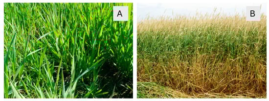 Reed canary grass (P. arundinacea) occurs commonly in the wild in the temperate climate zones of North America, Asia, and Europe []. It is a hydro- and nitro-philous species, and is very well tolerant of even long-term surface flooding and periodic droughts. In Poland, it is found in its natural state, especially on fertile floodplains, and was also a common component of meadow sward. Due to its production of large amounts of biomass, it is used for energy production, e.g., for direct combustion and the production of biofuels and biogas [,,,,,,].