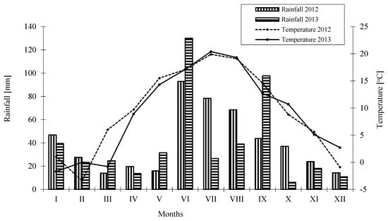 Meteorological data from 2010/2011, 2012/2013, and 2015/2016 (Figure 2, Figure 3 and Figure 4) indicate differences in precipitation and air temperatures. The warmest season was 2015/2016, in which the average air temperature was 10.3 °C. In this season, positive air temperatures were recorded in December, January, and February. The warmest months in the 2015/2016 season were July and August, with an average temperature between 19.3 °C and 22.4 °C. The coldest season was 2010/2011, with an average annual temperature of 9.1 °C. In this season, negative air temperatures were recorded for the winter months, i.e., December, January, and February. The coldest year was 2010, when the average air temperature in January was −5.9 °C; in December of the same year the average air temperature was −5.3 °C. The wettest season was 2010/2011, with the highest average total rainfall of 584.4 mm (in 2010 it was 704.6 mm and in 2011 it was 464.2 mm). The heaviest rainfall occurred in 2010 in the months of May (127.1 mm), July (116.8 mm), and September (115.3 mm). The 2012/2013 and 2015/2016 seasons were characterized by very similar total rainfalls of 471.4 mm (2012/2013) and 431.1 mm (2015/2016), respectively. The driest year was 2015, with the lowest annual rainfall of 357.3 mm.