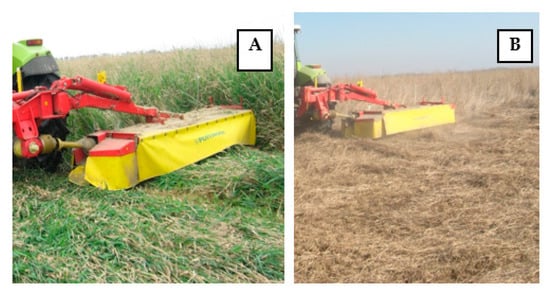 The summer harvest of reed canary grass biomass was carried out using a Kuhn disc mower (KUHN, Saverne, France) (Figure 5A). Then, the cut canary grass was laid to dry on the swath for about 10–14 days to obtain moisture in the range of 15–17%. On the other hand, the winter harvest of reed canary grass was carried out in one stage using a cutting machine and a Claas square baler (CLASS, Harsewinkel, Germany). The winter harvest was carried out in one stage, because the canary grass cut at that time contained only about 10% moisture (Figure 5B). The entire experiment was conducted up until 2016. This article uses the research results obtained from the 2010/2011 season (one-year plantation), the 2012/2013 season (three-year plantation), and the 2015/2016 season (six-year plantation).
