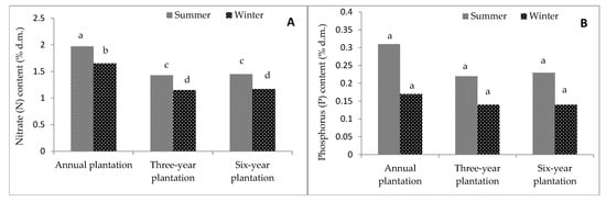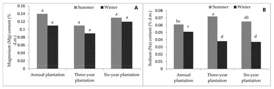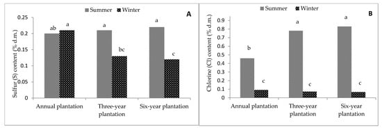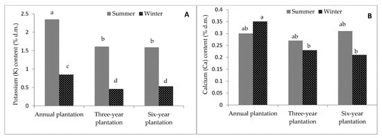 According to Golińska and Kozłowski [], Podlaski et al. [], Ustak et al. [], and Zardzewiały et al. [], each type of biomass is characterized by specific features that determine its value in the combustion process. Our own research shows that the biomass of the reed canary grass obtained from the summer harvest from the annual plantation was characterized by a high content of some elements, especially nitrogen (1.97% d.m.), potassium (2.35% d.m.), and phosphorus (0.31% d.m.), compared to the content of these elements in the biomass obtained from the three- and six-year plantations. The differences in the contents of these elements depending on the age of the plantation was statistically confirmed for nitrogen and potassium, while, for phosphorus, these differences turned out to be insignificant. Also, in the case of other elements, i.e., sodium and sulphur, the differences in the content of these elements depended on the harvest date and the age of the plantation. The highest sodium content (0.072% d.m.) was found in the biomass obtained from the summer harvest of the three-year plantation, and the lowest was from the winter harvest of the six-year plantation (0.037% d.m.). On the other hand, the average sulphur content was the highest in the biomass obtained from the annual plantation, regardless of the harvest date (0.20% d.m.—summer harvest and 0.21% d.m.—winter harvest). On the other hand, the lowest amount of sulphur was contained in the biomass obtained from the winter harvest of the six-year plantation (0.12% d.m.), which was statistically confirmed. Only the magnesium contents (from 0.09% d.m. to 0.14% d.m.) in the biomass remained at a similar level, regardless of the age of the plantation or the harvest date, which was statistically confirmed. However, different results were obtained for calcium, as its content was the highest in the biomass obtained from the winter harvest from the annual plantation (0.35% d.m.), and the lowest in that obtained from the six-year-old plantation, also from the winter harvest. However, the differences obtained in the content of this element in the biomass collected in the summer period (irrespective of the age of the plantation) were statistically insignificant (Figure 6, Figure 7, Figure 8 and Figure 9).