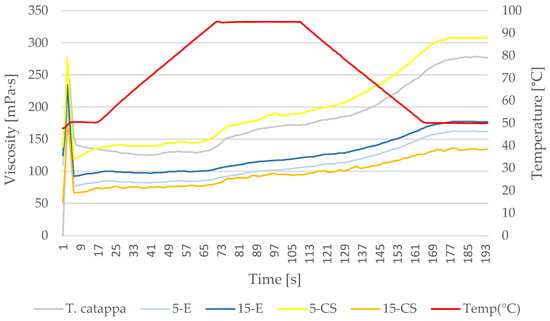 Adding higher concentrations of sweeteners (15% of erythritol and cane sugar) resulted in even lower viscosity profiles throughout the entire pasting cycle. These blends do not show isolated peaks with a viscosity of approximately 100 mPa·s during the heating and maintaining phase, resembling the profile of pure T. catappa.