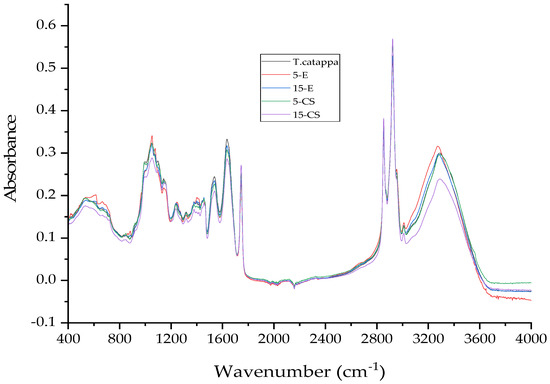 FTIR spectra of T. catappa and its erythritol and cane sugar blends.
