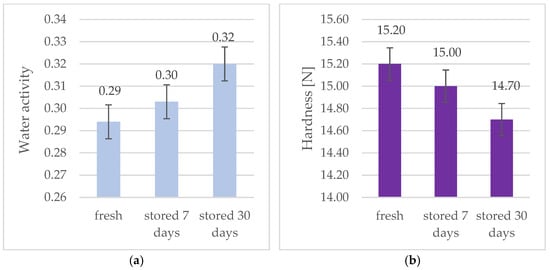 Quality features of cookies during storage (a) Water activity; (b) Hardness.