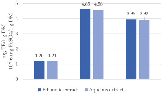 Variance analysis showed that the type of extractant used did not affect the value of reducing activity (FRAP) of the tested control raw material. Furthermore, variance analysis showed that adding a sweetener did not affect the value of reducing activity of the tested raw material (relative to the control) in the case of extraction with an ethanol solution. It is indicated that potent reducing agents include alkali metals, such as sodium, magnesium, zinc, calcium, and potassium, which are present in significant amounts in T. catappa seeds [43].