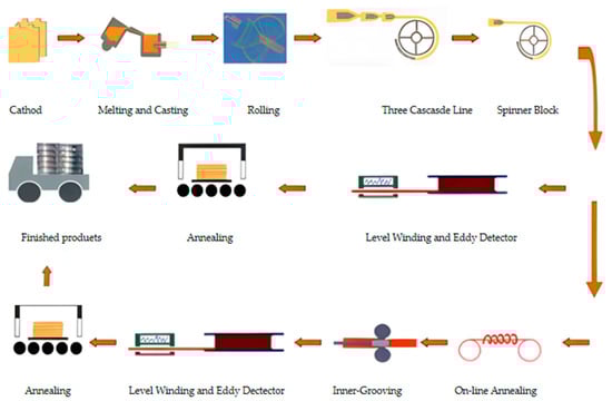 2]. Currently, the production of TP2 copper tubes primarily employs the casting–rolling process, which includes steps such as melting and casting, rolling, joint drawing, and coiling. The casting–rolling process flow for copper tubes is illustrated in