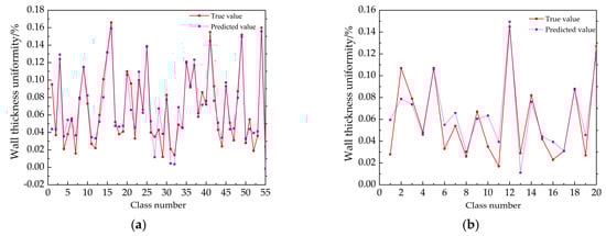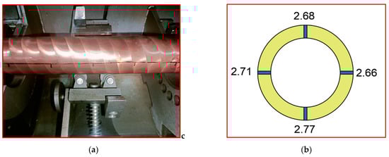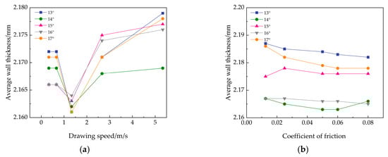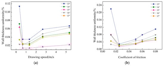 Gradually increasing the drawing speed, sections of copper tubes after joint drawing were taken at different speeds. The wall thickness of these copper tubes was measured, and the wall thickness uniformity was calculated using Equation (7). The resulting wall thickness and wall thickness uniformity at different drawing speeds are presented in