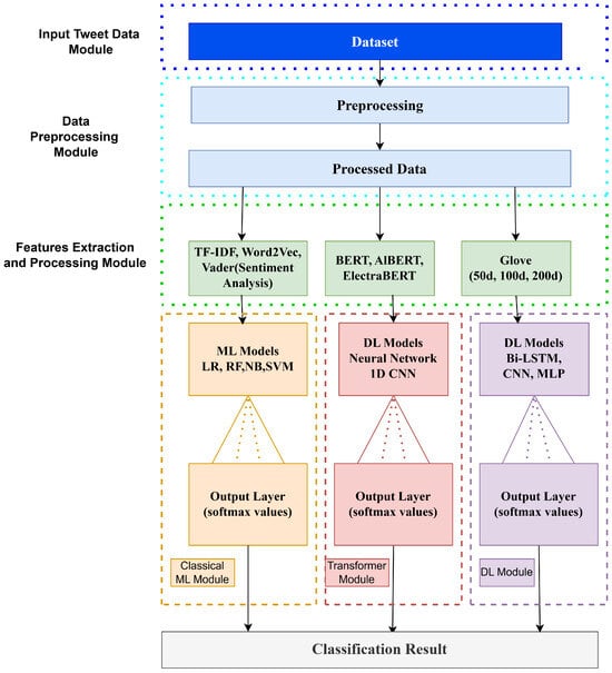 In this section, we present an abstract overview of the proposed architecture for offensive language detection. Figure 1 provides a detailed visualization of our complete pipeline, from data preprocessing to final classification. Our proposed methodology encompasses ML classifiers (LR, RF, NB, SVM), DL classifiers (neural network, CNN, BiLSTM, MLP), and transformer models (BERT, ALBERT, ElectraBERT).