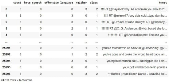 The tweet sample from the dataset shown in Figure 2 presents six distinct columns, each serving a specific purpose in our offensive language detection framework. The primary input for our models is the “tweet” column, which contains the raw text data collected from Twitter. These text data go through our comprehensive preprocessing pipeline before feature extraction. The “count” column provides frequency information about tweet occurrences, offering insights into data distribution patterns. Three annotation-related columns, “hate speech”, “offensive language”, and “neither” contain the counts of how annotators labeled each tweet. These columns provide valuable information about annotator agreement and help in understanding the complexity of classification decisions. While not directly used as input features, these annotation counts serve an important role in data quality assessment and analysis of challenging cases. The final column “class” serves as our target variable, containing the consolidated classification labels derived from the annotation process. This column uses a numerical encoding where 0 represents hate speech, 1 indicates offensive language, and 2 denotes content that is neither hate speech nor offensive. This target variable is used for both model training and evaluation phases of our experiments.