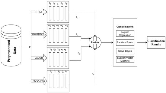 Furthermore, sentiment analysis was conducted using VADER [], wherein sentiment feature vectors were represented as F3 = (v1, v2, v3, v4, …, vn). VADER employs a lexicon-oriented approach to establish labels, applied at the word level, with words evaluated based on their positive or negative sentiment scores.