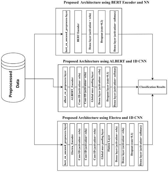 - A novel architecture is proposed using BERT (Bidirectional Encoder Representations from transformers), ALBERT (A Lite BERT), and ELECTRA (Efficiently Learning an Encoder that Classifies Token Replacements Accurately) as encoders, and for pre-processing, we use neural networks and 1D CNNs as classification layers.