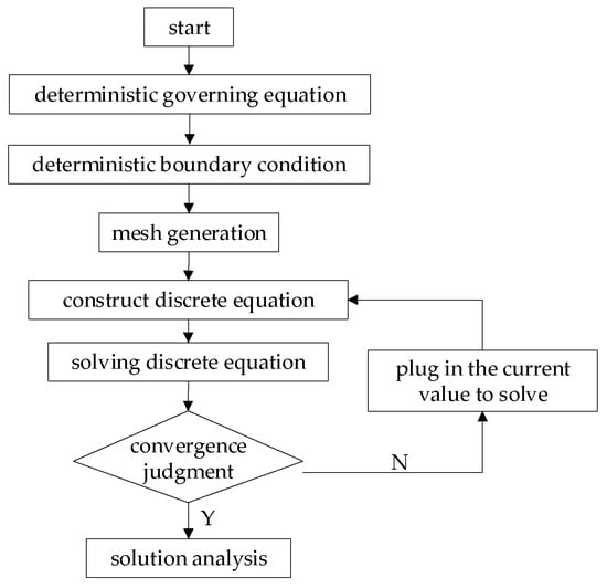 The numerical solutions are as follows. Because the computational domain is replaced with a series of discrete points, the relationship of variables at these points was established by a governing equation. The differential equation was discretized into an algebraic equation. Variables at the discrete points could be solved [20]. Figure 3 depicts the flow diagram of numerical calculation. The governing equations of the computational domain are generally mathematical formulations of physical laws, and various conservation laws can be expressed using partial differential equations. However, the analytical solutions of a partial differential equation cannot be obtained in many cases. The partial differential equation should be first discretized and subsequently solved by a numerical method to acquire its approximate solution.