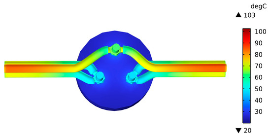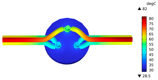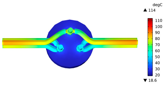 Current loads were applied to the flameproof cable box for coal mines to simulate the temperature distribution characteristics at various failure currents. During the failure simulation of the box, the failure current was configured at 180 A, 240 A, 300 A, or 360 A, and the ambient temperature was set to 15 °C. Because the maximum temperature rise suitable for the safe running of the flameproof cable box for coal mines was 65 K, the temperature characteristics simulation ceased when the temperature rise reached this value in the simulation. In this case, temperature distribution cloud maps were obtained, as presented in Figure 5, Figure 6, Figure 7 and Figure 8. Specifically, Figure 4 is a temperature distribution cloud map for the flameproof cable box at 180 A. This figure reveals that the temperature reached 80.7 °C at 1065 s when the failure current was set at 180 A, and the temperature rise in this case was approximately 65.7 K. Figure 5 indicates the temperature distribution of the box when the failure current was set at 240 A. The temperature and temperature rise were up to 81.1 °C and 66.1 K, approximately, at 365 s. Figure 6 depicts the temperature distribution at 300 A, where the temperature and temperature rise, respectively, reached 81.3 °C and approximately 66.3 K at 210 s at such an operating condition. Finally, the temperature distribution of the box with a failure current of 360 A is plotted in Figure 7, which reveals that temperature and temperature rise, respectively, were 81.0 °C and 66 K at 135 s.