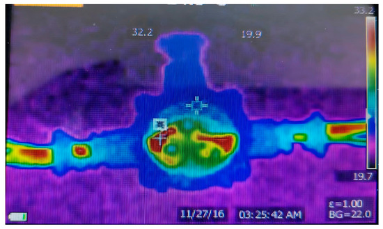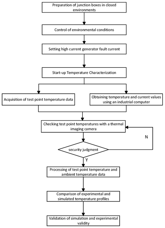 Temperature characteristics testing was conducted in an enclosed environment specific to the flameproof cable box for coal mines. Figure 9 depicts the experimental flow chart. During the testing, the effects of unusual extraneous heating or cooling were avoided [25,26]. Furthermore, the wind velocity within 1 m from the box should not exceed 0.1 m/s, and external air flows were not introduced [27,28]. A high-current generator was used to supply power in the temperature characteristics testing for the box at failure conditions. A thermocouple and a temperature rise recorder were used to collect and convert temperature data. An industrial computer was adopted to acquire the temperature and experimental current values of the box at failure conditions. Furthermore, a thermal imaging camera was used to detect the temperature of test points during temperature characteristics testing.