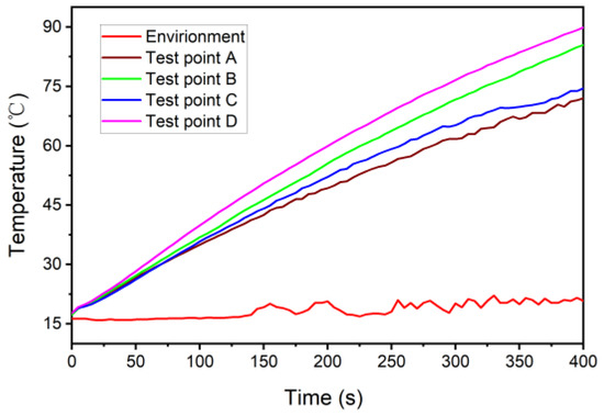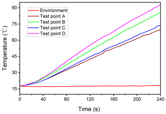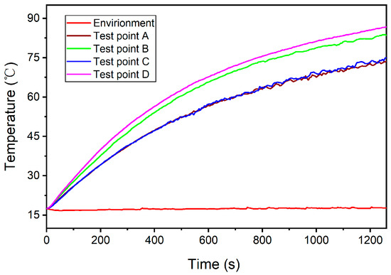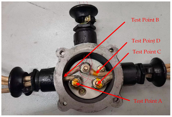 Wiring terminal A, entry, wiring terminal B, and internal guidelines were used as test points based on a thermal imaging map produced by temperature characteristics experiments for the box and denoted as Test Points A, B, C, and D. Moreover, Figure 11 depicts the thermal imaging map. By taping, the thermocouple was fixed on the test points mentioned to test the temperature. Figure 12 depicts the positions of these test points. The temperature at test points of the box was obtained from the thermocouple and documented at an interval of 5 s at the temperature rise recorder since energization. During the temperature characteristics testing, the temperature of the box was tested at various failure currents of 180 A, 240 A, 300 A, and 360 A, and the testing stopped when the temperature rise reached its upper limit for safe running (i.e., 65 K). Next, time-varying temperature curves were obtained for the flameproof cable box for coal mines. We processed the temperature data of the test points and ambient temperature data. Thus, relation curves of the temperature rise and time were acquired for the box.