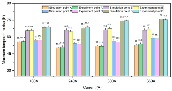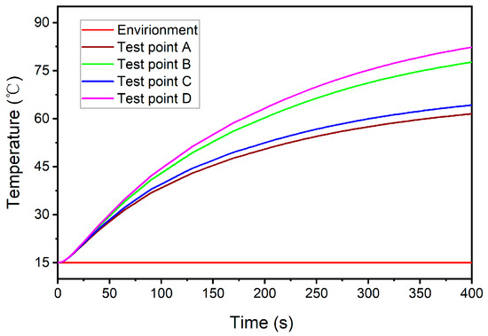 Figure 15 and Figure 16 present the temperature rise curves of the box at 240 A current under experiment and simulation, respectively. The results of temperature rise measured by simulation and experiment are similar, and the temperature reaches the limit value of temperature rise at the test point D first, the temperature limit of the box at 240 A current. They indicate that the temperature at Test Points B and D increased rapidly; the temperature at Test Point C is slightly above that at Test Point A. As can be seen from the simulation results, the temperature at test point D is the first to reach the limiting temperature rise value at 365 s, which is 80.234 °C, and the ambient temperature is 15 °C, with a corresponding temperature rise of about 65.234 K. In the experiment, the temperature of measurement point D is 85.5 °C, the ambient temperature is 19.9 °C, and the corresponding temperature rise is about 65.6 K. The error between the two is 0.06%, which is in line with the standard.