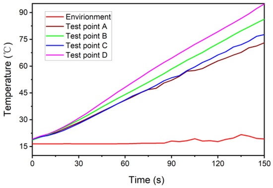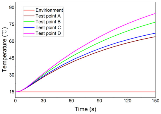 Figure 19 and Figure 20 plot the time-varying temperature and temperature rise curves under the failure current set to 360 A for the box under experiment and simulation, respectively. Similarly, the temperature at Test Points B and D increased rapidly, the temperature at Test Point C was higher than that at Test Point A, and the temperature of Test Point D at 135 s was 86.7 °C under experiment. The ambient temperature at 86.7 °C was 21.7 °C, and the corresponding temperature rise was approximately 65.0 K. The temperature of Test Point D at 135 s was 80.584 °C under simulation. The ambient temperature at 86.7 °C was 15 °C, and the corresponding temperature rise was approximately 65.584 K. The error between the two is 0.09%, and the two temperature rise results are similar.