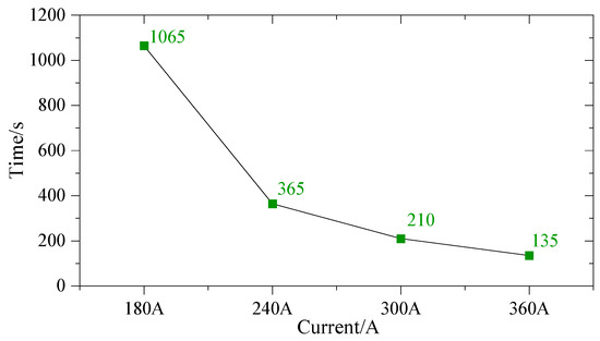 The simulation results of the temperature characteristics of the flameproof cable box for coal mines were compared with the experimental outcomes. Figure 21 depicts the relevant comparison results. This figure reveals that the difference between simulation and experimental results is not greater than 1 K, which proves the validity of the simulation model. At various failure modes, the upper time limit to ensure the safe running of the flameproof cable box for coal mines was separately configured to be 1065 s, 365 s, 210 s, and 135 s. The relationship between respective failure current and time is depicted in the failure characteristic curves in Figure 22. These characteristic curves were inverse-time, which conformed with the characteristic curve variation tendency of explosion-proof electrical equipment used in coal mines. Therefore, the validity of simulation and experiments was proved.