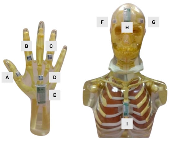 This investigation highlights the critical role of using phantoms to determine the energy response calibration for personal monitoring dosimeters, which measure radiation exposure across different body parts (Figure 5) [37]. An RSD anthropomorphic head phantom with a complete cervical spine (C1–C7) was used for Hp(3) eye lens dose equivalent measurements. An RSD anthropomorphic thorax phantom is used for Hp(10) deep dose equivalent and an anthropomorphic hand phantom for Hp(0.07) shallow dose equivalent measurements.