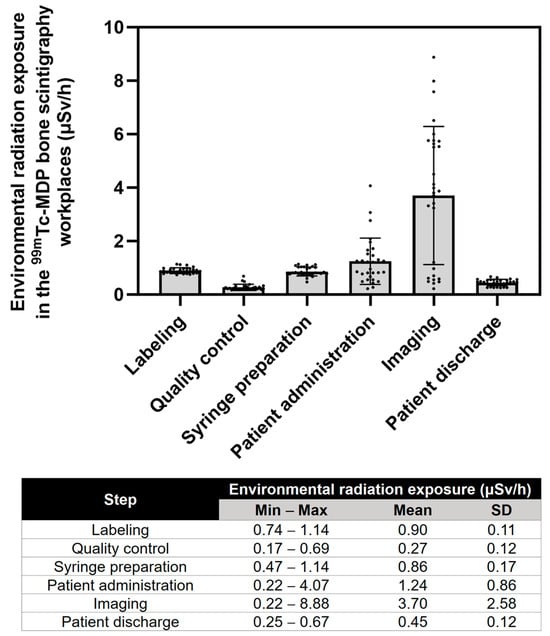 Environmental radiation exposure in 99mTc-MDP bone scintigraphy workplaces during different steps: labeling, quality control, syringe preparation, patient administration, imaging, and patient discharge. Results are presented as mean ± standard deviation (n = 30).