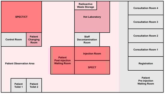 The nuclear medicine floor plan illustrates the layout and arrangement of equipment and workstations designed to prepare and handle the 99mTc-MDP radiopharmaceutical. This layout includes designated controlled areas essential for assessing radiation doses in nuclear medicine procedures. Key areas, such as the SPECT/CT and SPECT rooms, are prominently featured alongside specialized rooms, including the hot laboratory, radioactive waste room, and injection room. The plan also organizes staff and patient movement through specific spaces, such as pre-injection, post-injection, and consultation rooms, thereby ensuring a safe and efficient workflow throughout the nuclear medicine facility.