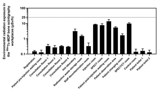Evaluation of environmental radiation exposure within controlled areas of a nuclear medicine center during 99mTc-MDP bone scintigraphy procedure. The data are presented as mean ± standard deviation (n = 30).