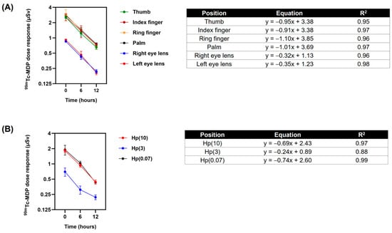 99mTc-MDP dose response over time at Hp(10), Hp(3), and Hp(0.07). (A) Dose response (μSv) over 12 h at: thumb, index finger, ring finger, palm, right eye lens, and left eye lens. (B) Dose response for Hp(10), Hp(3), and Hp(0.07) over time, measured in μSv. Results are presented as mean ± standard deviation (n = 30).