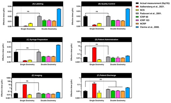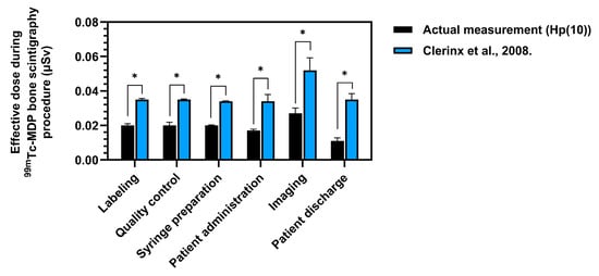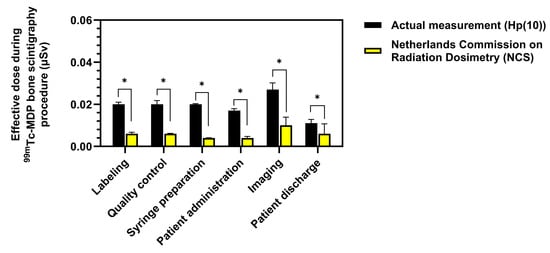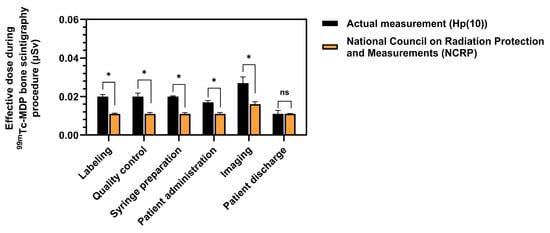 The results of the NCS algorithm (Equation (5)) based on a single OSL to estimate staff occupational effective dose are illustrated in Figure 6 [40]. The bar graph illustrates the effective radiation dose recorded at different stages of 99mTc-MDP bone scintigraphy procedures, including labeling, quality control, syringe preparation, patient administration, imaging, and patient discharge. In each stage, actual dose measurements were compared with the NCS algorithm. Notably, the imaging stage recorded the highest actual radiation dose, surpassing 0.05 µSv, while the NCS algorithm estimated a dose of 0.01 µSv for this stage, which was significantly lower. Moreover, at all stages, the NCS algorithm estimated values are substantially different from the actual occupational effective doses recorded and marked as statistically significantly different at p < 0.05. In summary, the NCS algorithm should be used cautiously as our analysis has highlighted a significant underestimation of occupational effective doses from 99mTc-MDP bone scintigraphy procedures.