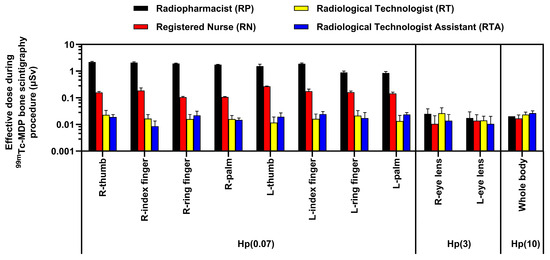 Nuclear medicine staff involved in 99mTc-MDP procedures were personally monitored for occupational effective dose. Specifically, the following personnel were monitored throughout the preparation, administration, and diagnostic procedures involving 99mTc-MDP: radiopharmacists, nurses, radiological technologists’ assistants, and radiological technologists. To measure the occupational effective dose of the nuclear medicine staff, a nanoDot OSL dosimeter and Inlight type OSL (Quixel) badges were used. The effective dose measurements were recorded at Hp(10) and Hp(0.07) for the skin, hands, and feet, and Hp(3) for the eye lens. The personal dose equivalent in soft tissue is represented by the symbol Hp(d), according to the International Commission on Radiation Units & Measurements (ICRU) standard [15,16,17].