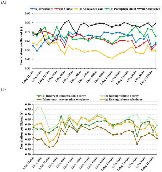 Table 3, a detailed analysis was conducted of the implications of these results. Firstly, it is important to point out that the average energy of the sound wave over the full spectrum is a relevant sound characteristic for estimating the occurrence and importance of effects such as irritability (a), startle (b), raising the volume of the conversation in situ (e), the noisy street (h), and annoyance (i), with Pearson correlation coefficients of between 0.70 and 0.81. The highest values for the explanation of variability were obtained for annoyance, and this has a certain uniformity for all the acoustic variables analysed in this section.