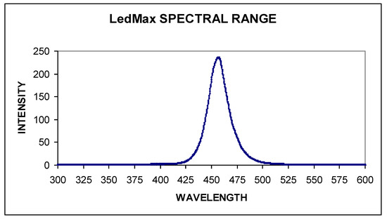 The area under the curve in the figure represents the total power output of the spectral flux of the LCU. The spectral flux symbolizes the optical power output from the LCU in milliwatts (mW) at each given wavelength (nm). The spectral irradiance of the LCU was determined by dividing the output power by the area of the light exit window or light guide tip (mW/cm2) [11,13]. The wavelength of the emission spectra of the LED LCU used in the study (determined by the handmade photoluminescence system) ranged between 418.724 and 512.268 nm, and the light intensity of the LED LCU was 229.153 mW/cm2 at a peak wavelength of 458.595 nm. The peak of the LED LCU with a narrow spectral distribution coincides with the CQ absorption curve peak at about 460 nm. The details of the LED LCU used in this study are listed in Table 2 [32].