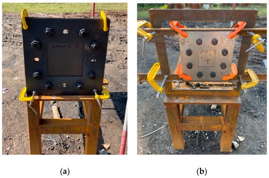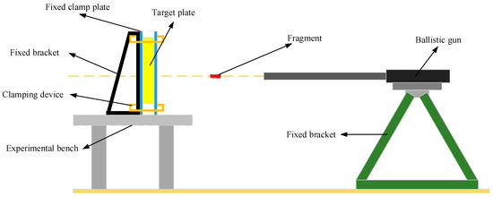 The small specimen fixture and the large specimen fixture are both tightened by bolts. After the specimen and fixture are combined, the assembled target plate is fixed on the 500 mm × 500 mm steel frame with a stable seat by four U-shaped clamps, as shown in Figure 2. The fragment and the cartridge case are connected by a sling and pressed by a press. The total length of the fragment and the cartridge case is 160 mm. The launcher uses a 14.5 mm ballistic gun, and a first benchmark is set at 452 mm in front of the target and a second benchmark is set at 590 mm behind the target. The initial impact velocity and residual velocity of the fragment are measured by high-speed photography equipment.