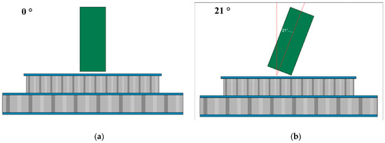 Fragments impact the sandwich structure at 0° and 21°. (a) is 0°; (b) is 21°.