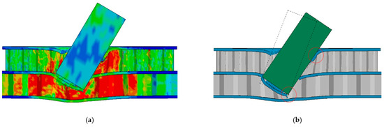 The deformation trend of the structure is different under different angles of impact. When the fragment invades the interior of the composite honeycomb sandwich structure, the in-plane direction resistance ability of the honeycomb structure is smaller than the out-of-plane direction, resulting in stress concentration in the projection area of the fragment in the out-of-plane direction, and the fragment deflects toward the in-plane direction with low resistance. Due to the increase in the projection area of the fragment in the out-of-plane direction, the compression area of the structure increases, resulting in an increase in the energy absorption effect of the structure, so that the front skin of the sandwich structure is subjected to a large lateral force, and the reaming is more obvious. The structural pressure cloud diagram is shown in Figure 5a, and the initial angle position and deflection position of the fragment are shown in Figure 5b.