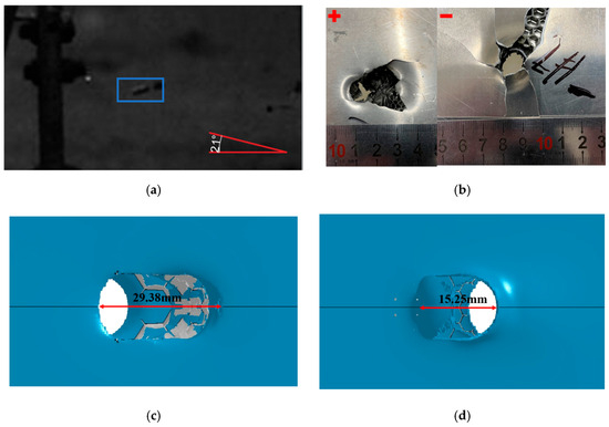 Simulation and test of fragments impact the sandwich structure (21°). (a) is Fragment belt angle impact sandwich structure diagram; (b) is Damage results of sandwich structure; (c) is Numerical simulation results of front skin damage; (d) is Results of skin damage after numerical simulation. The “+” in the middle indicates the positive side; “-” indicates the back in (b).